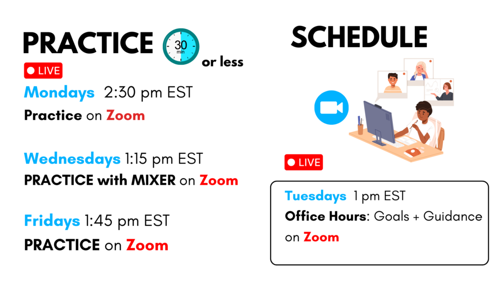 Live Practices ON ZOOM NEW: All live practices are now on Zoom. Use the yellow button to enter. Times in many time zones ⬇️ Join Zoom Practice here Meeting ID: 874 6519 7143Passcode: talk Time Zone Converter